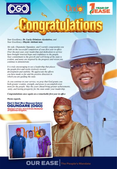 Chief and Chief (Mrs.) Oluwaseyi Gabriel Ogundare have joined well-meaning stakeholders across Ondo State in celebrating the first anniversary of Governor Lucky Orimisan Aiyedatiwa’s administration, describing the past 365 days as a period marked by purposeful leadership, strengthened governance, and visible developmental strides.