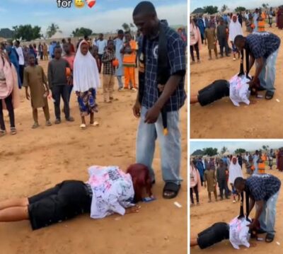 An emotional scene has melted hearts online after a young lady was captured lying flat on the dusty ground to thank her boyfriend — a mechanic — for sponsoring her education.