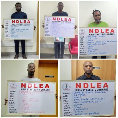 A statement released today November 7 by NDLEA spokesperson, Femi Babafemi, says the trio of Olasupo Michael Oladimeji; Muaezee Ademola Ogunbiyi; and Sola Adegoke who are leaders of one of the cartels were arrested following the seizure of 17.9 kilograms of cocaine concealed in textile materials and local charms going to Sydney, Australia at the export shed of the MMIA Lagos on 26th August 2025.