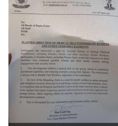 Earlier, an internal memo from the hospital raised concerns over an alleged plot by bandits and terrorist groups to abduct healthcare workers, including doctors, nurses, and auxiliary staff, particularly in frontline states such as Plateau.
