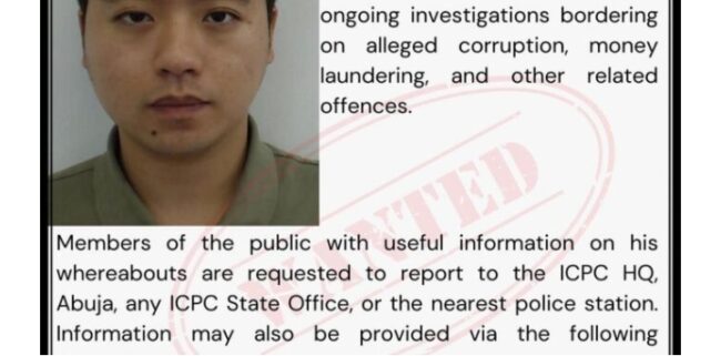 A Facebook post by the Commission’s Spokesperson, John Odey, Saturday, read: “The ICPC hereby declares Mr. Zhichao Qiu, a Chinese national, whose photograph appears above, wanted in connection with ongoing investigations bordering on alleged corruption, money laundering, and other related offences.