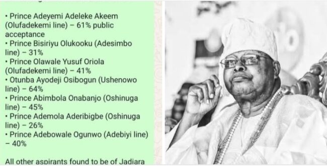 Prince Adeyemi Adeleke Akeem (Olufadekemi line) – 61% public acceptance