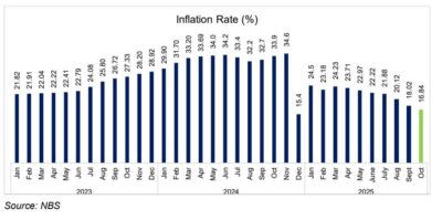 The National Bureau of Statistics has said that Nigeria’s headline inflation rate has dropped to 16.05 per cent in October 2025.