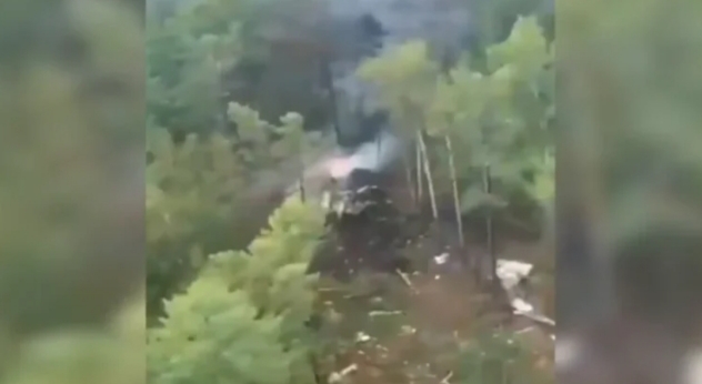 Visuals from the crash site show the wreckage of a plane engulfed in plumes of smoke and flames.