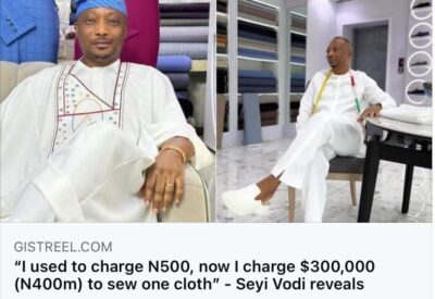 Nigerian billionaire fashion designer Oluwaseyi Adekunle, popularly known as Seyi Vodi, has stunned the fashion world with a bold revelation — he now earns as much as $300,000 (approximately ₦400 million) to create a single outfit.