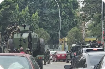 Pictures obtained by SaharaReporters show a large deployment of Nigerian Army personnel stationed around the commission’s premises, alongside armoured tanks and officers of the Nigeria Police Force bearing assault rifles and other weapons.