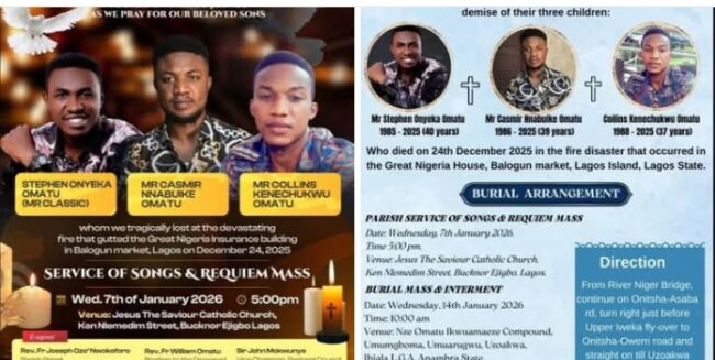 The three Omatu brothers who died in the inferno that razed a 25-storey building known as Great Nigeria Insurance House in Lagos Island, Lagos State, will be buried on January 14.