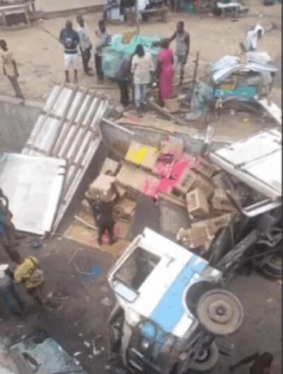 A devastating accident occurred in Lagos early Saturday when a truck skidded off the Oshodi bridge and plunged into the bus station below.