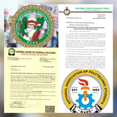 In open letter released to Newsmen to serves as a call to conscience and action directed to the Honourable Minister of Education, the National Association of Polytechnic Students (NAPS), the National Association of Nigerian Students (NANS), the Joint Admissions and Matriculation Board (JAMB) under Prof. Ishaq Oloyede, and the NYSC management to address this prolonged injustice.